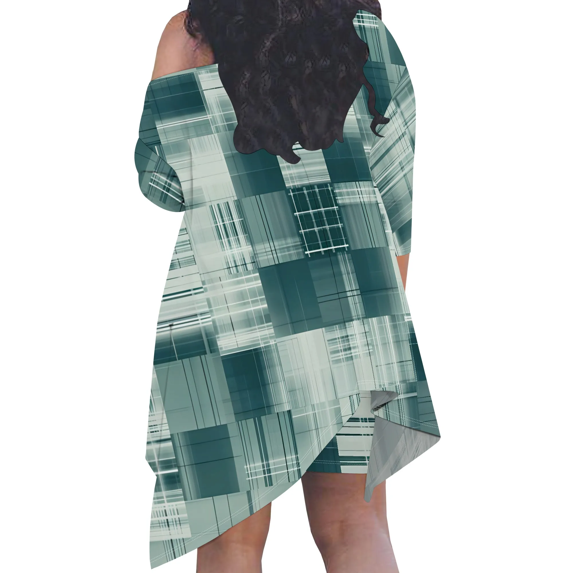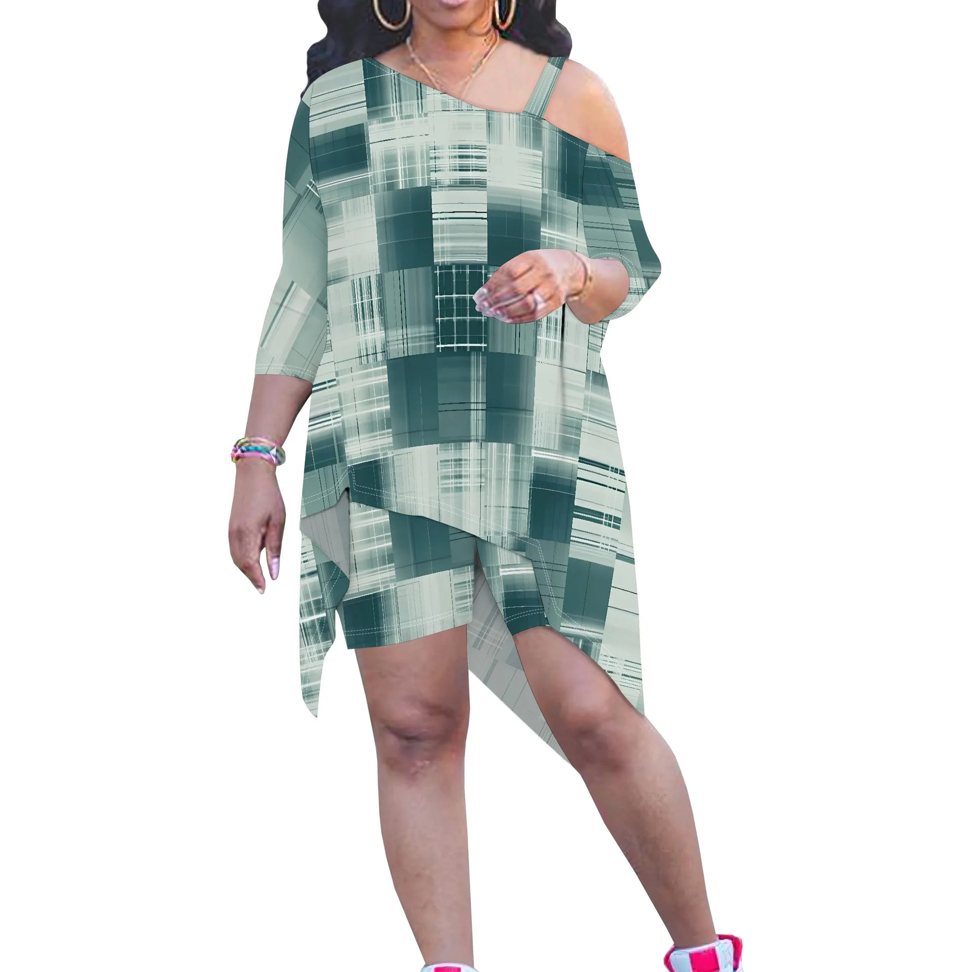 Plus Size Women 3/4 Sleeve Two Piece Set Asymmetrical Green Plaid Top and Shorts Casual Outfit
