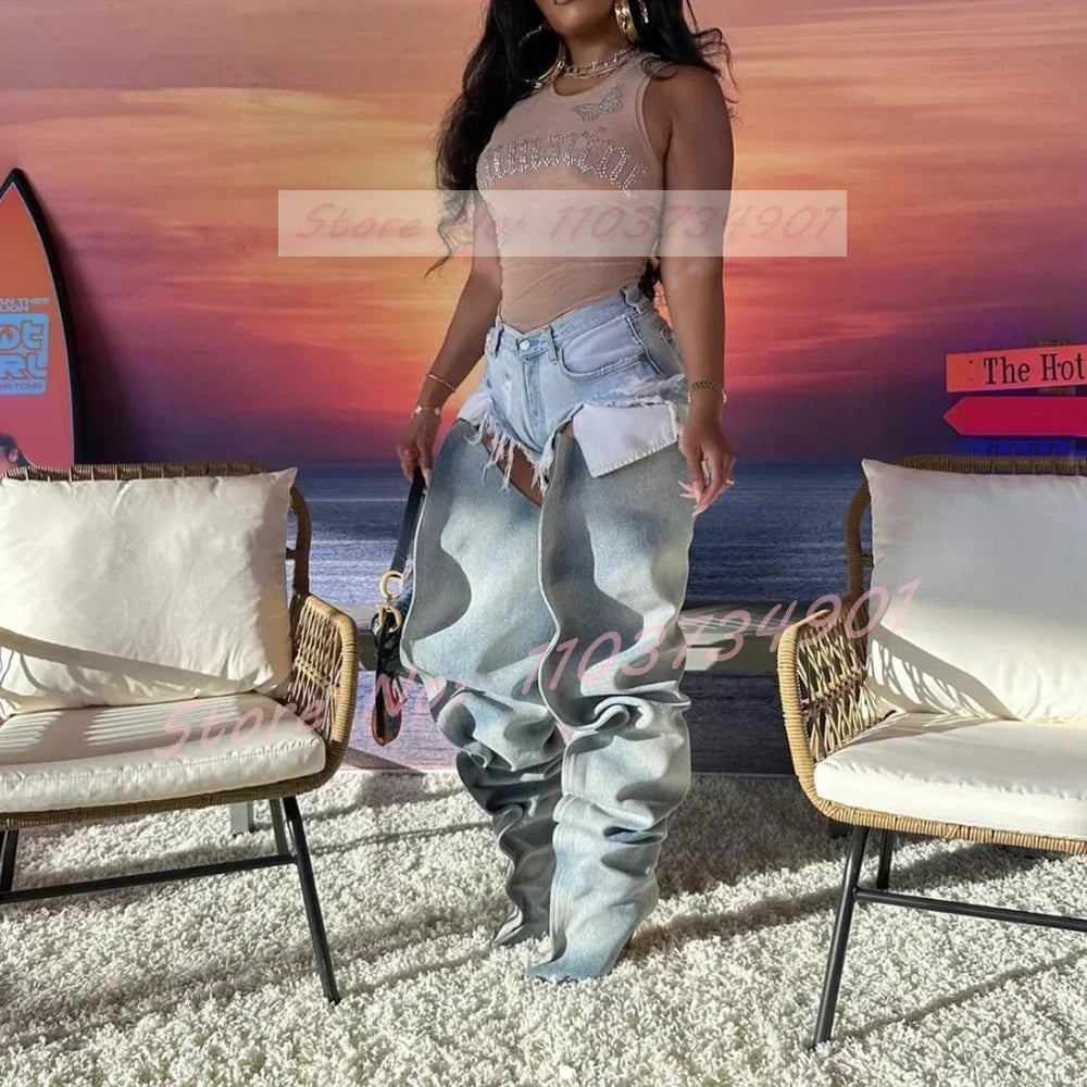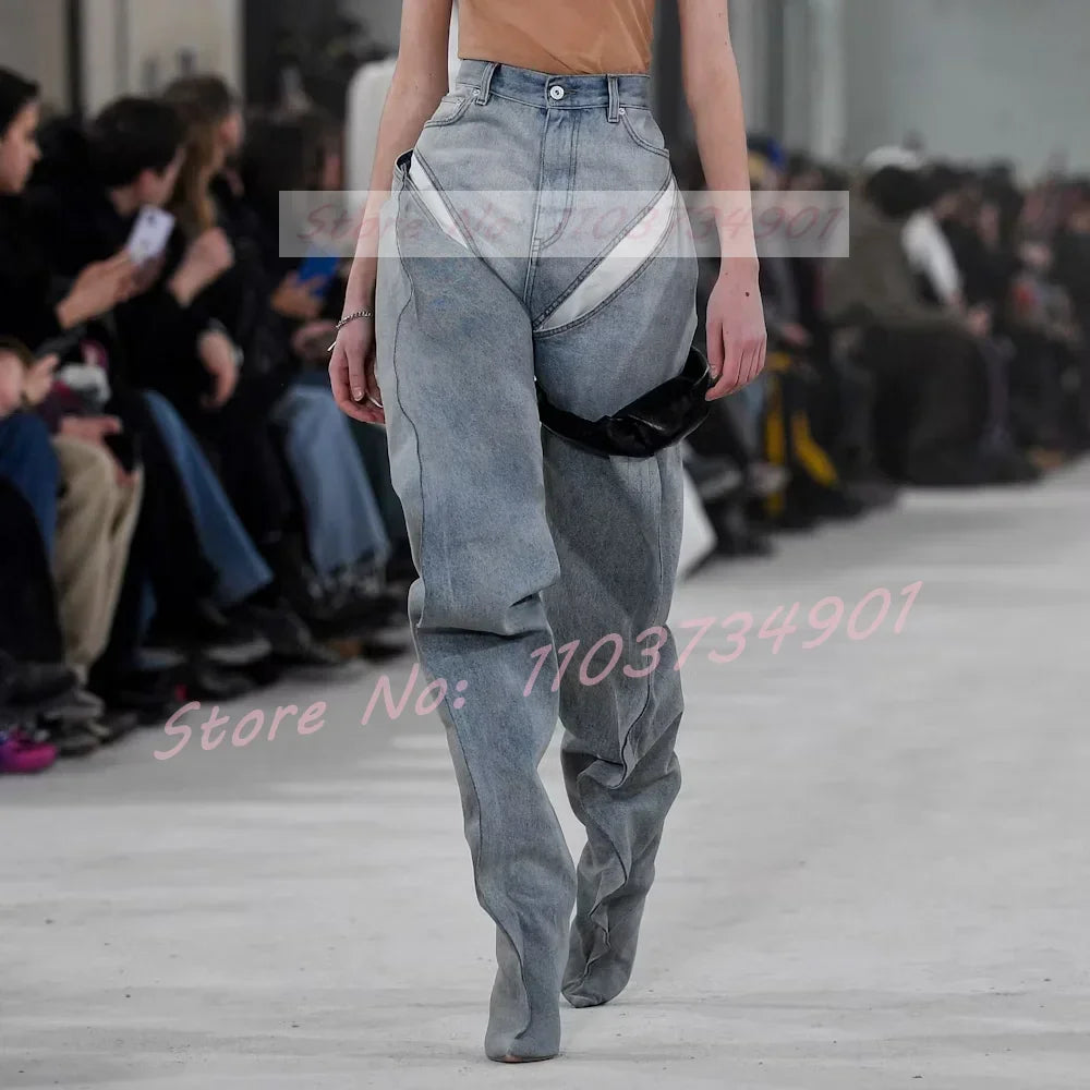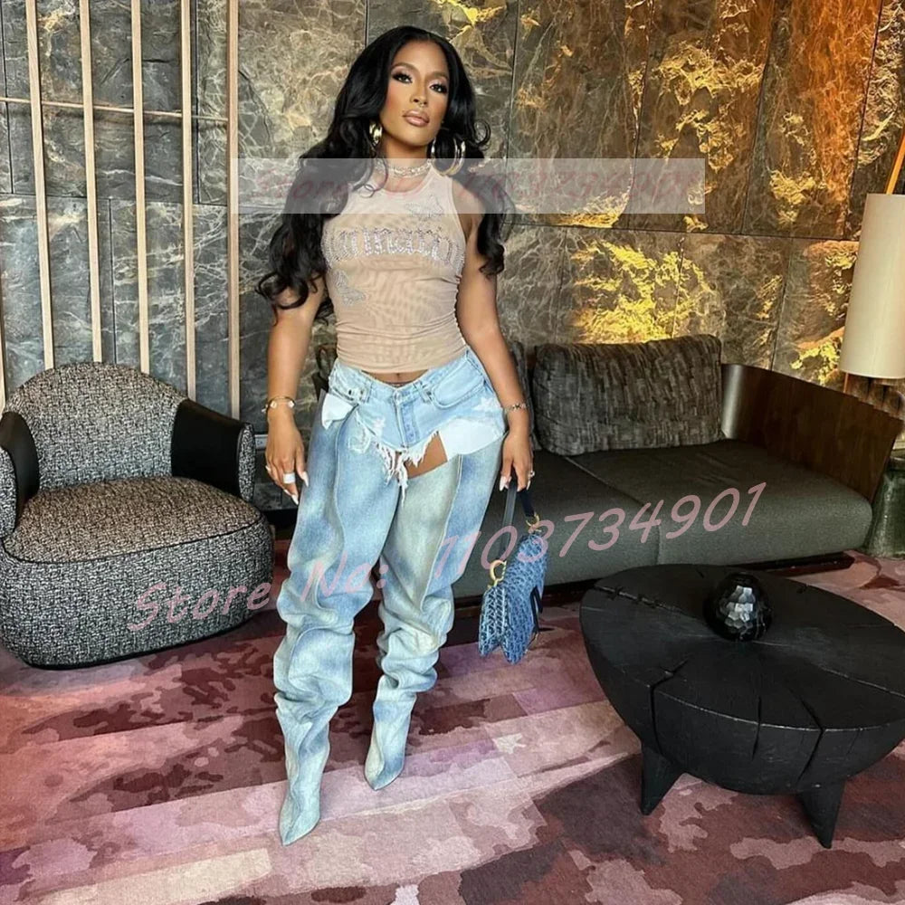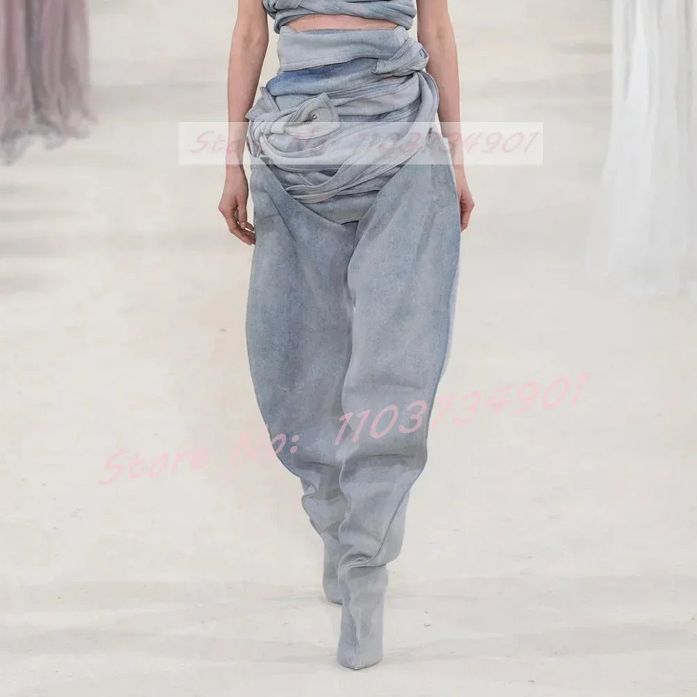 Denim Slip-On Crotch Fashion Pleated High Heels Boots