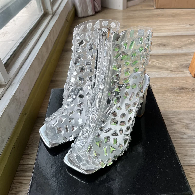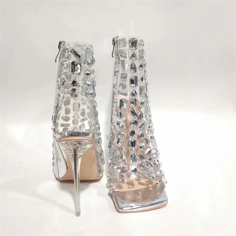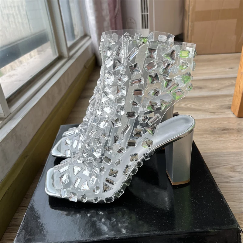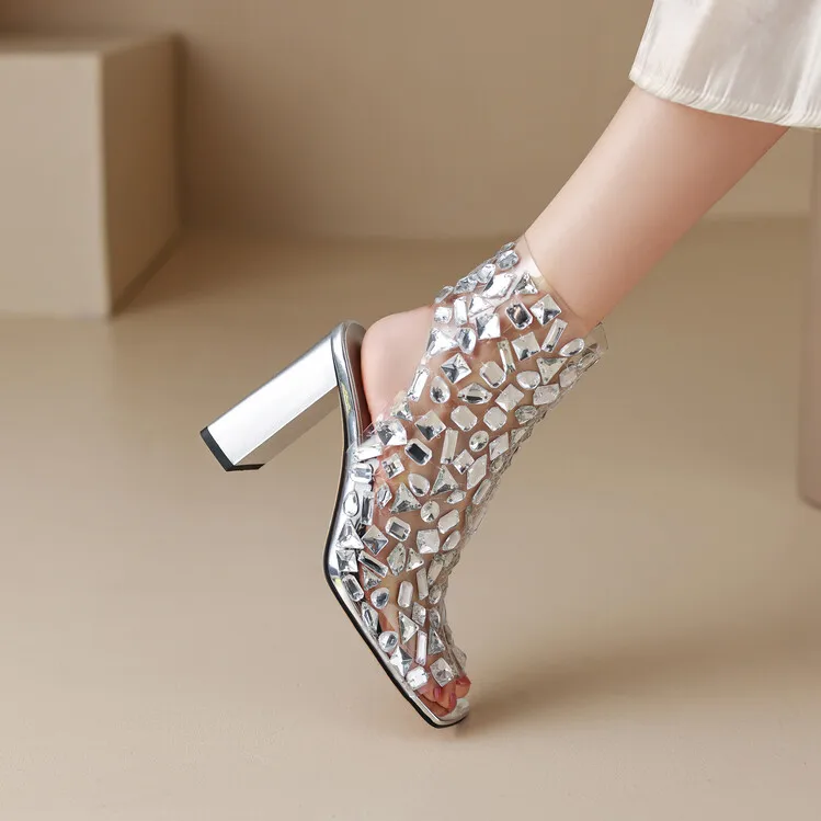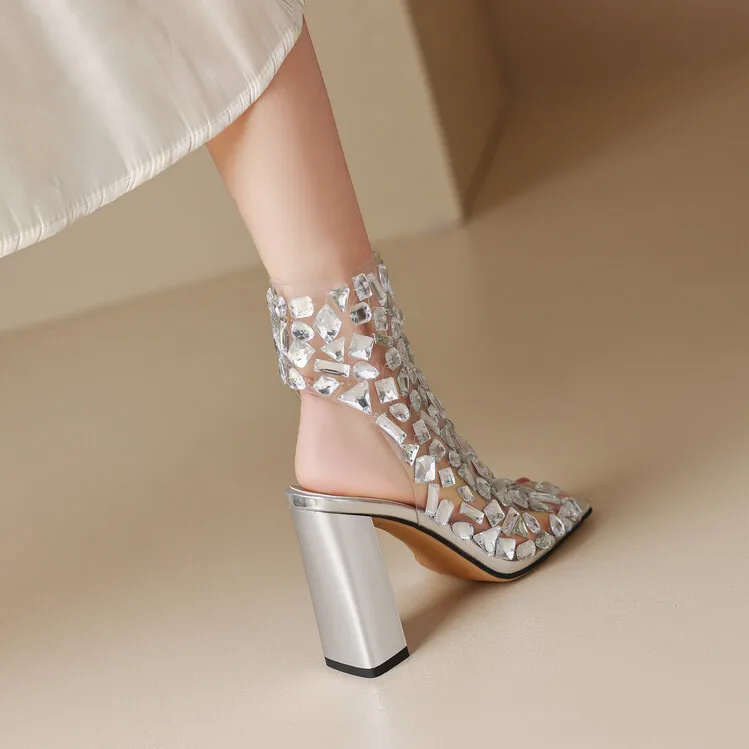 Brand Design 2023 New Crystal/rivet Zipper Sandals Stage Banquet Nightclub High Heels Women Shoes Apricot Silver Dress Matching