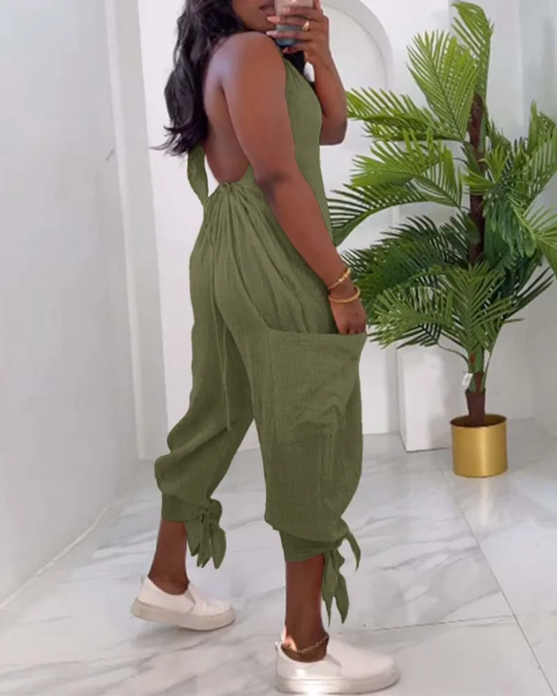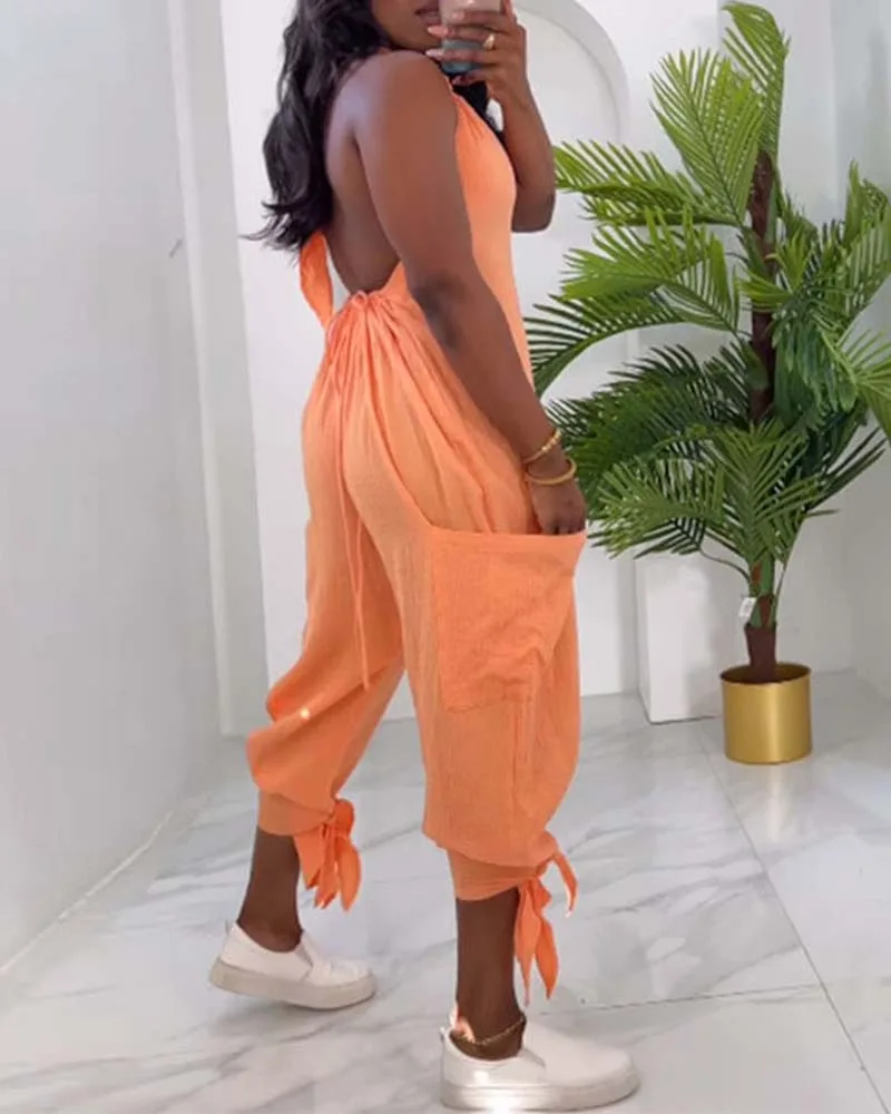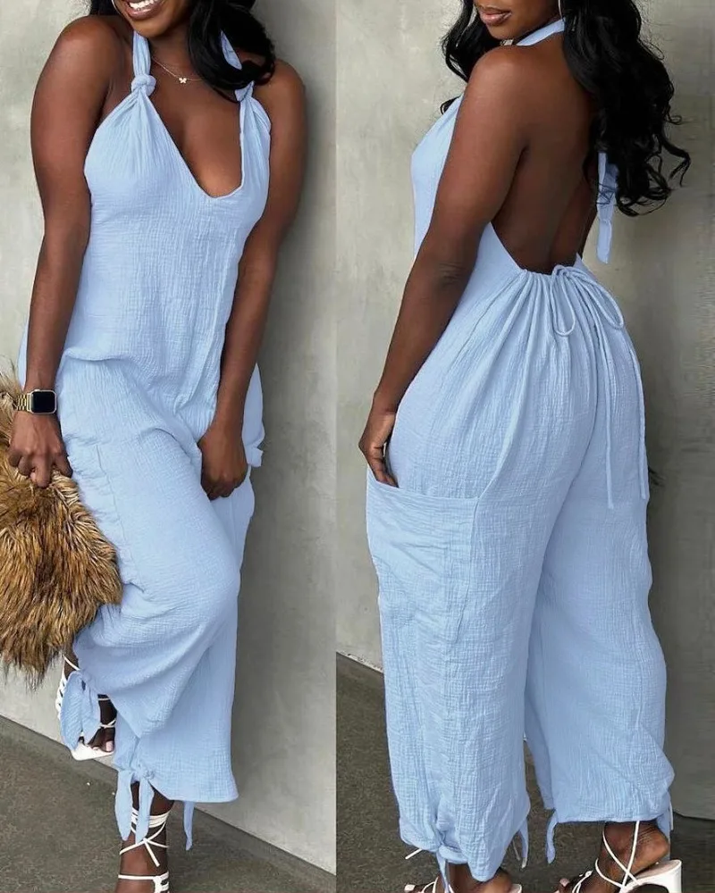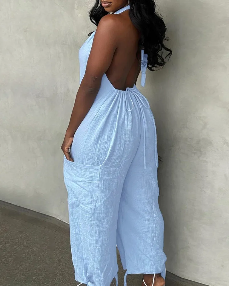 Casual Long Jumpsuits for Women Clothing Summer 2025 Trend Halter Tied Detail Pocket Design Jumpsuit Woman One Pieces Outfit