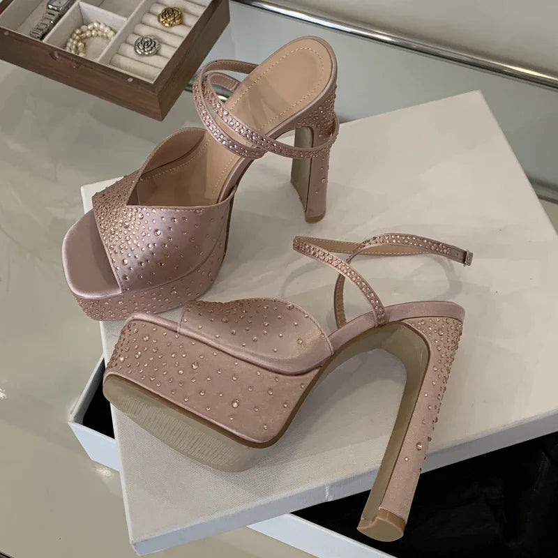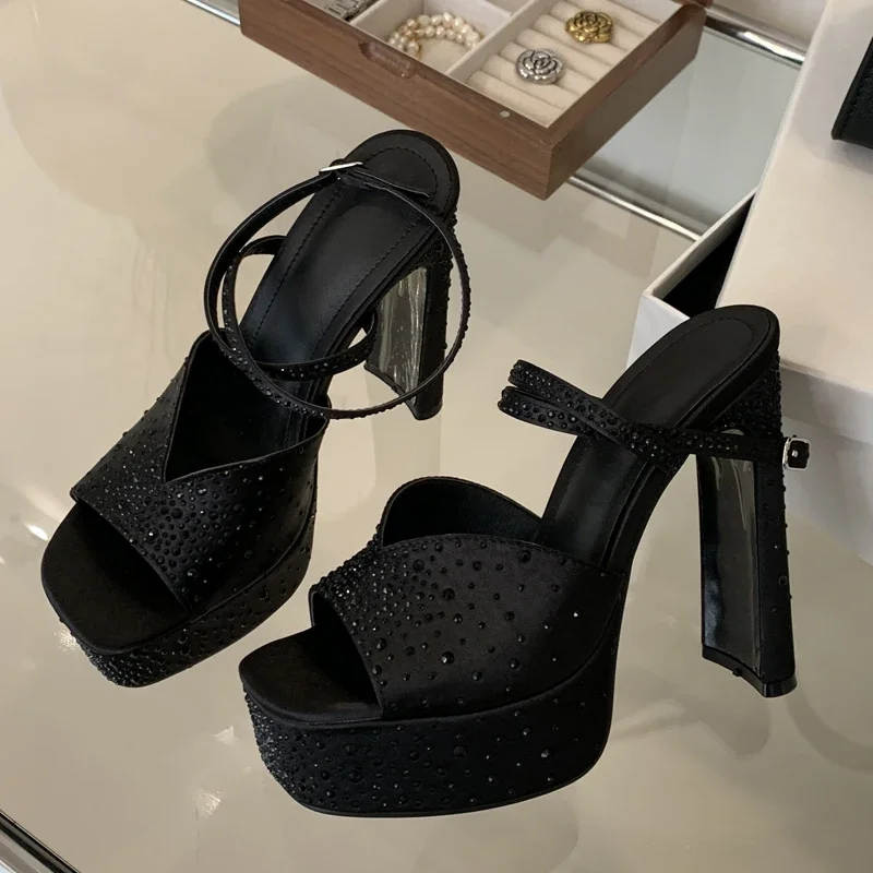Eilyken Design Crystal Square Toe Woman Sandals Sexy High Heels Ankle Buckle Strap Party Banquet Shoes Zapatos De Mujer