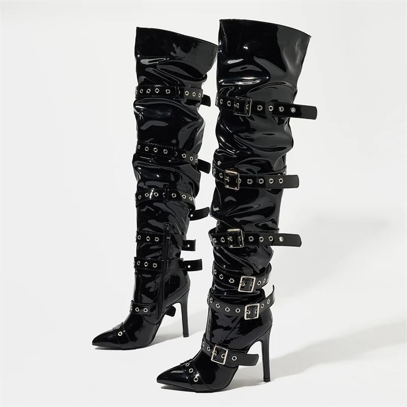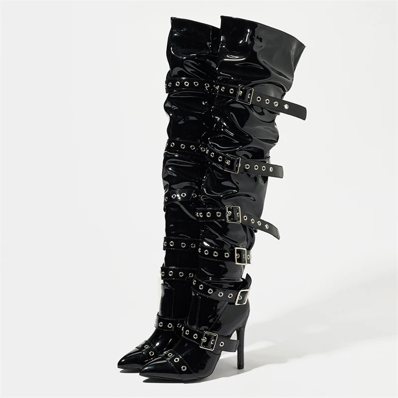 Eilyken Sexy Thin High Heels Patent Leather Women Over The Knee Boot Design Style Narrow Band Buckle Strap Stripper Shoes