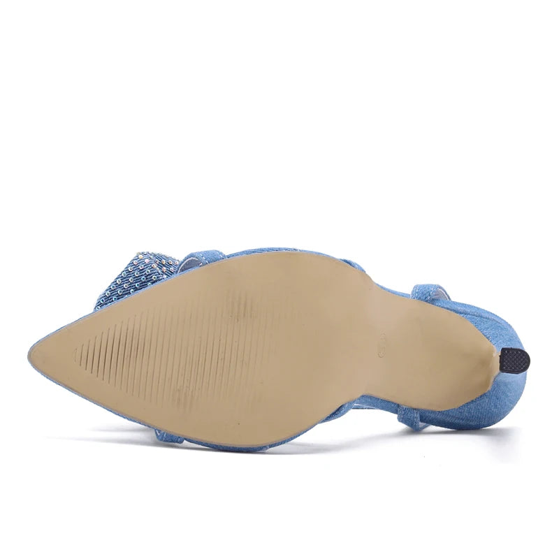 Eilyken Summer Ankle Buckle Strap Denim Sandals Women's CRYSTAL Flower Pointed Toe Thin Heels Shoes Party Prom Sandalias Mujer
