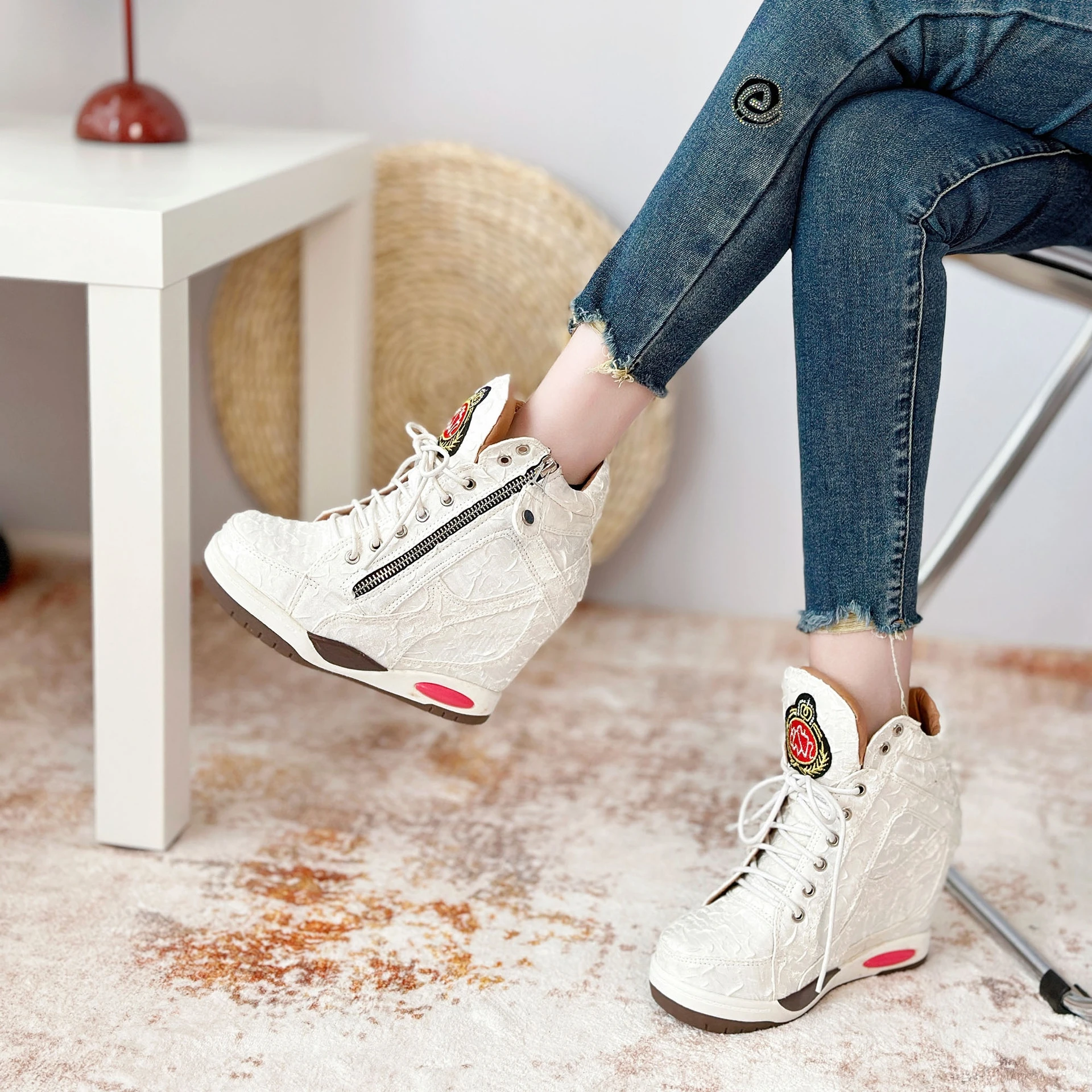 Fashionable and personalized sponge cake inner height increasing thick soled casual lace up short boots for women's autumn shoes