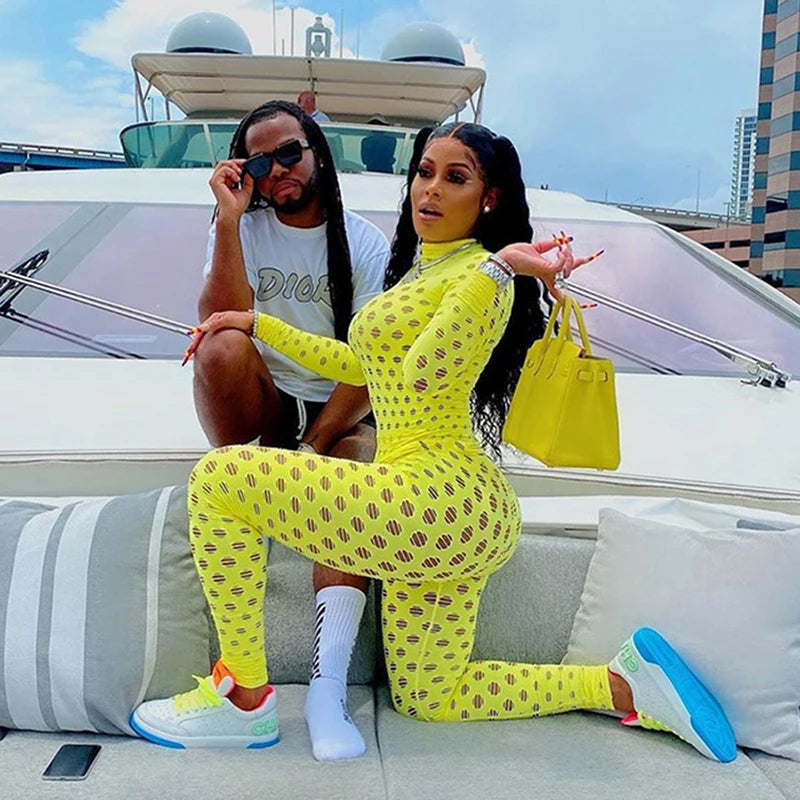 Hollow Out Jumpsuits Women 2021 Turtleneck Sexy Net Plaid Hole Skinny Elastic Club Streetwear Solid Rompers Female Outfits