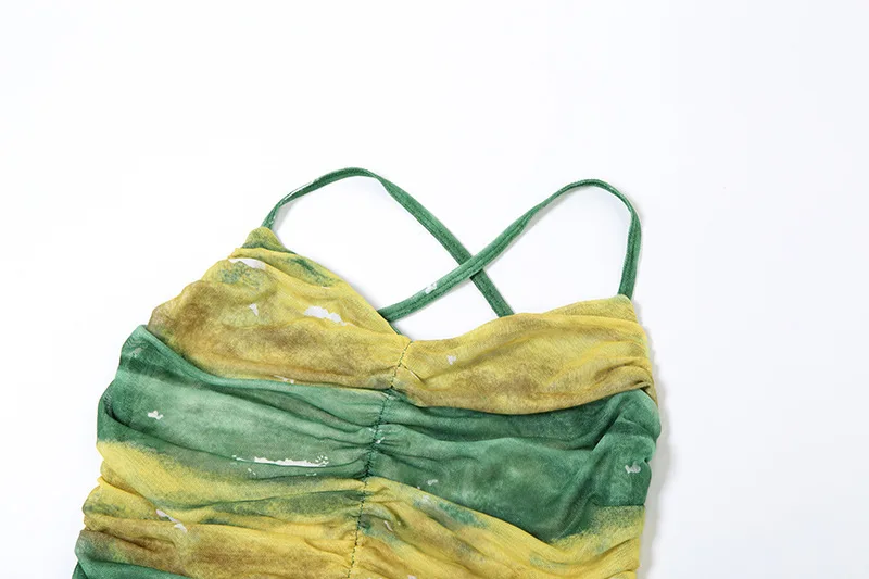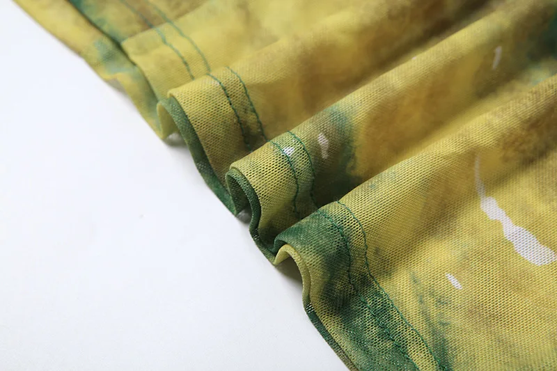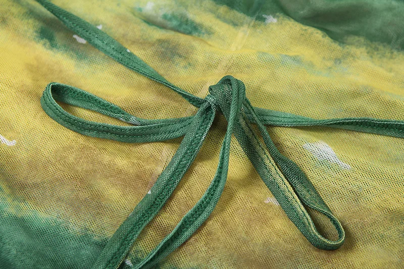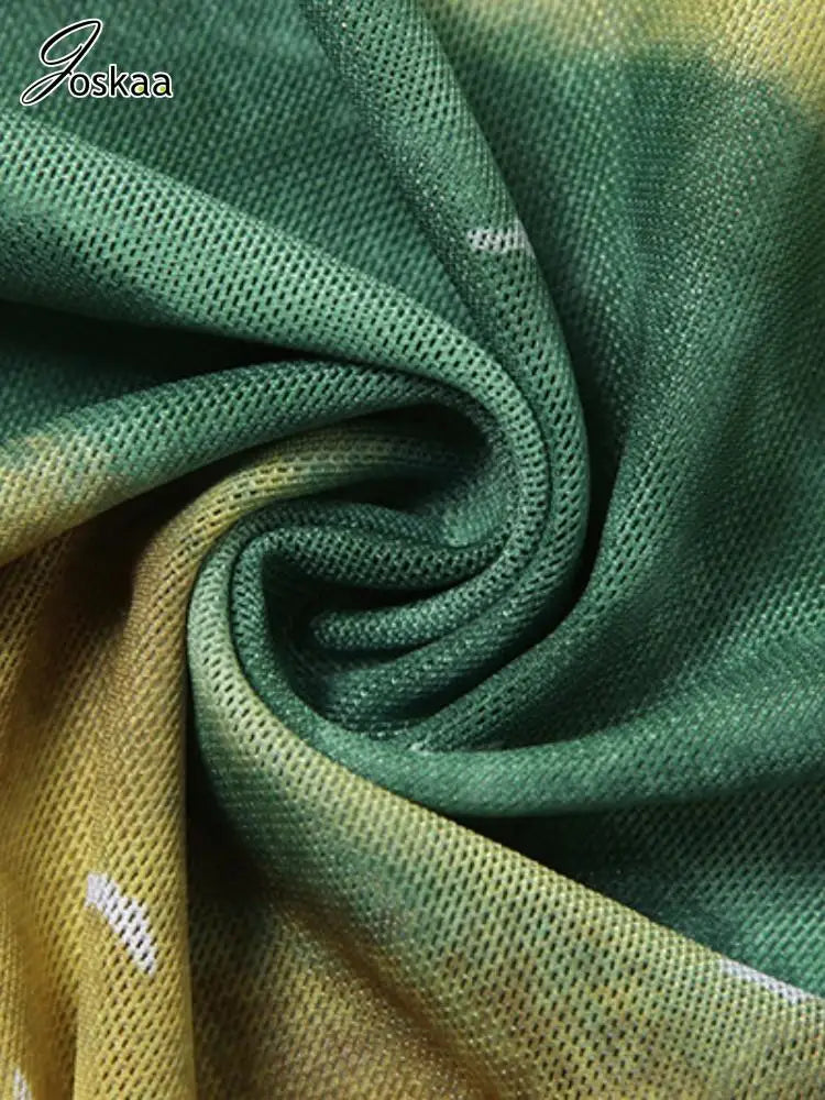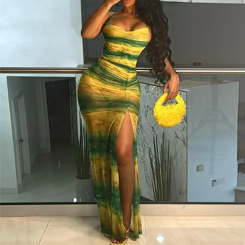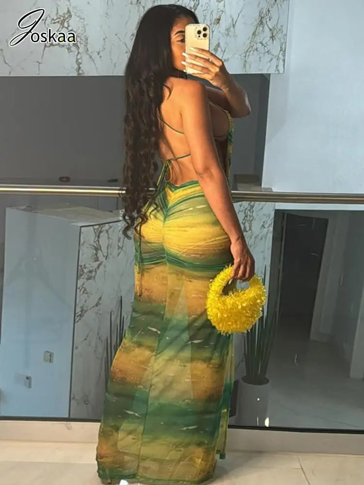 Joskaa Print Mesh See Through Long Vacation Dress Women Sexy Spaghetti Strap High Split Backless Bodycon Vestidos Party Clubwear
