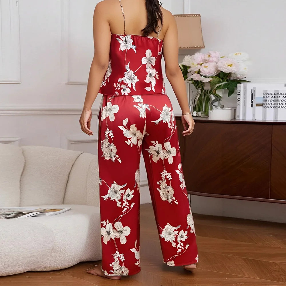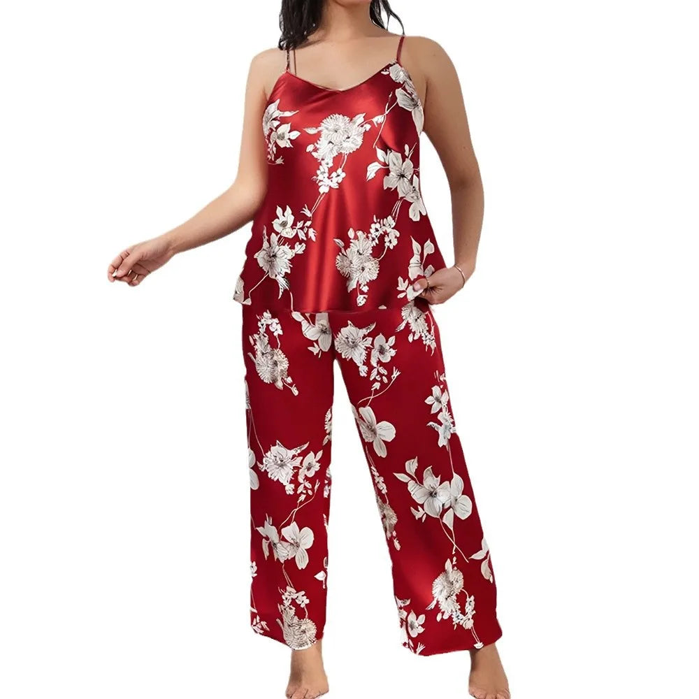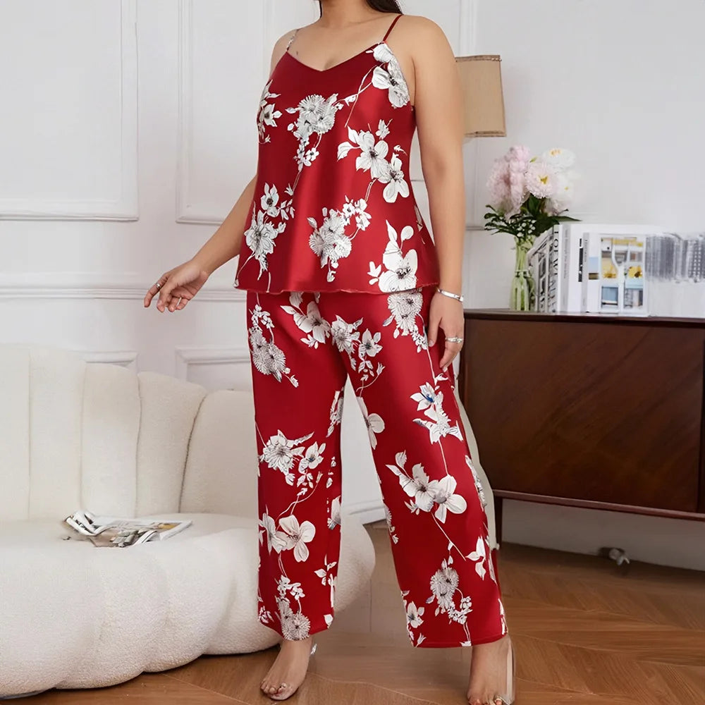 Plus Size 5XL New Female Pajamas Set Sleepwear Sexy Print Flower Suspender Trouser Pijamas Suit Lingerie Satin Home Clothes