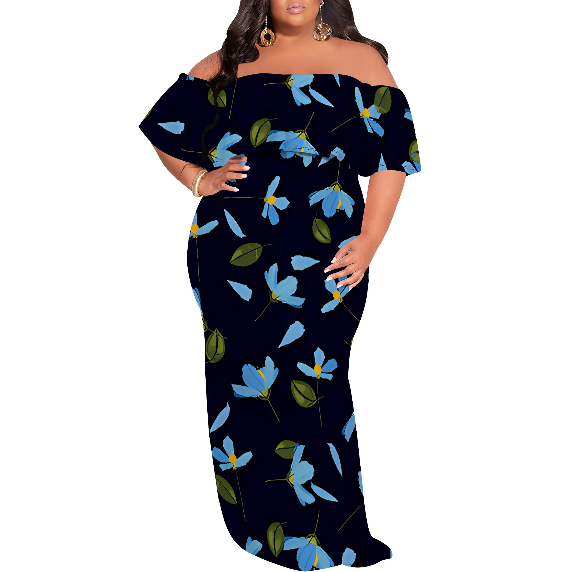 Plus Size Elegant Off Shoulder Dress for Women Blue Floral Print Summer Holiday Look