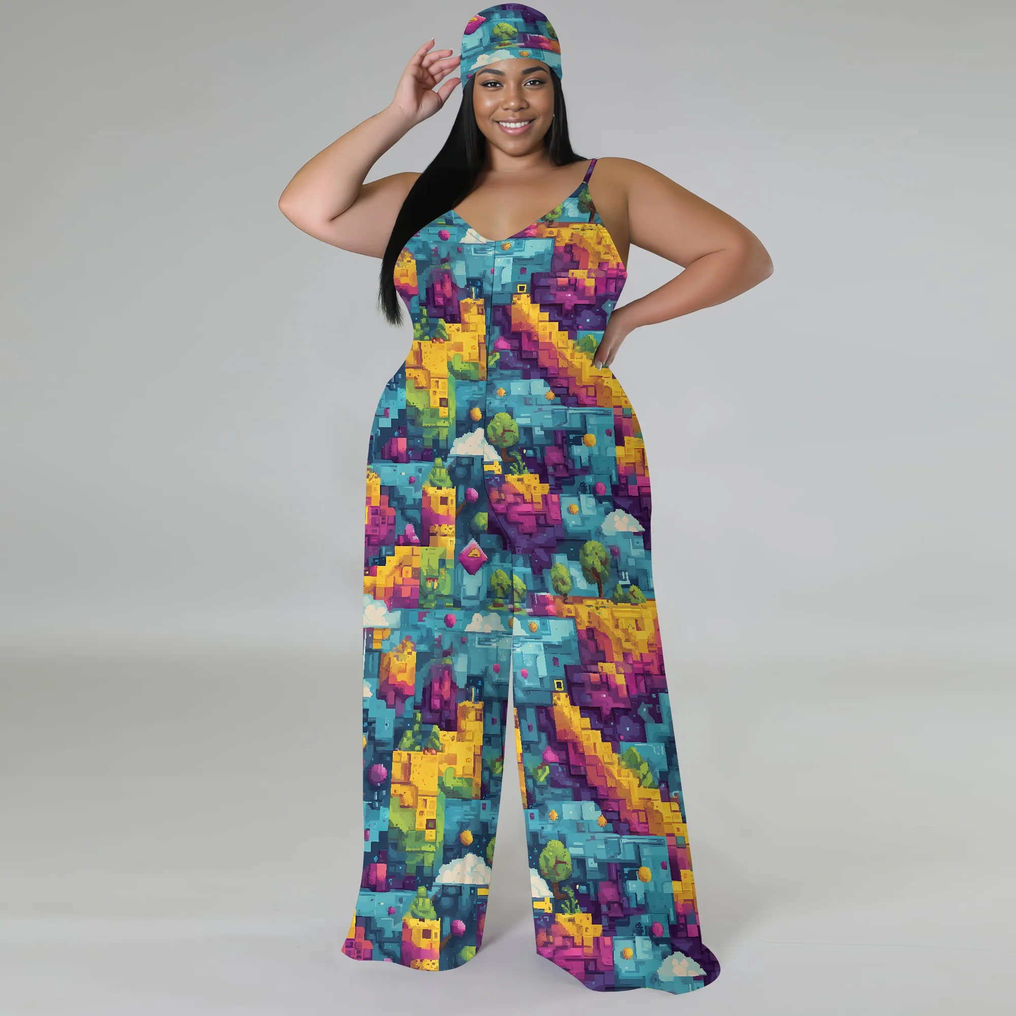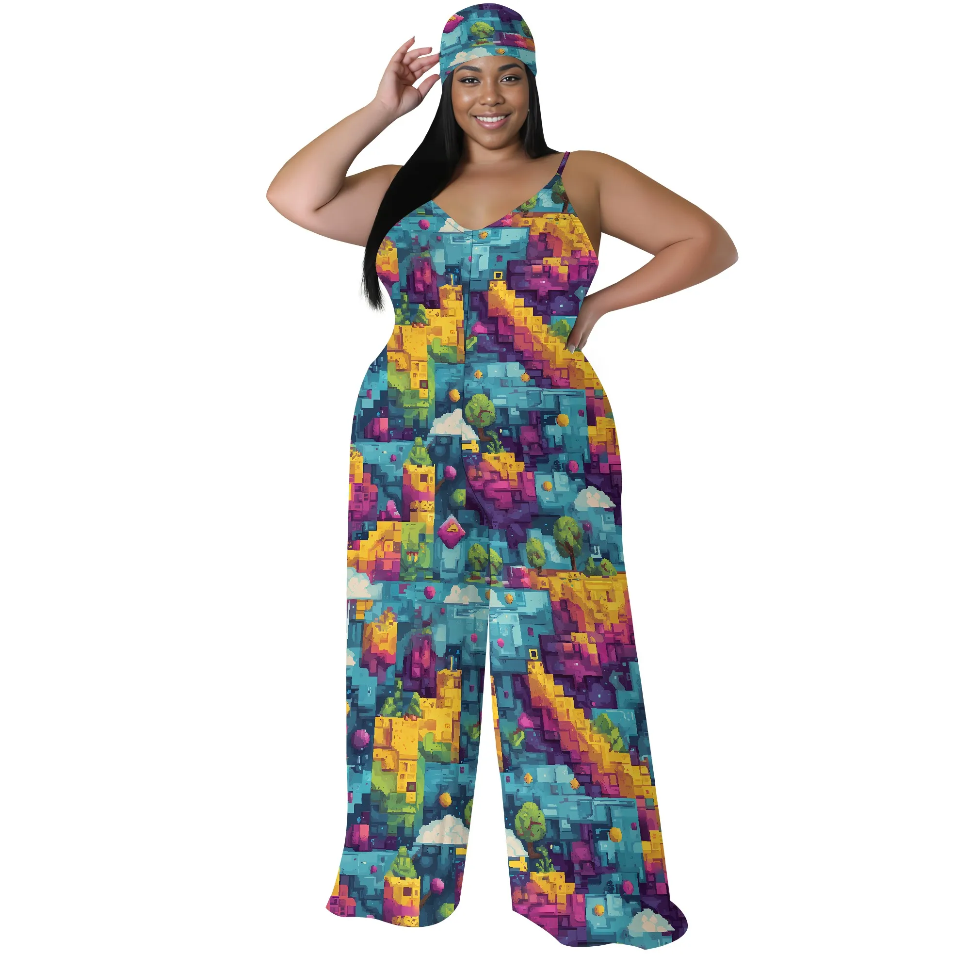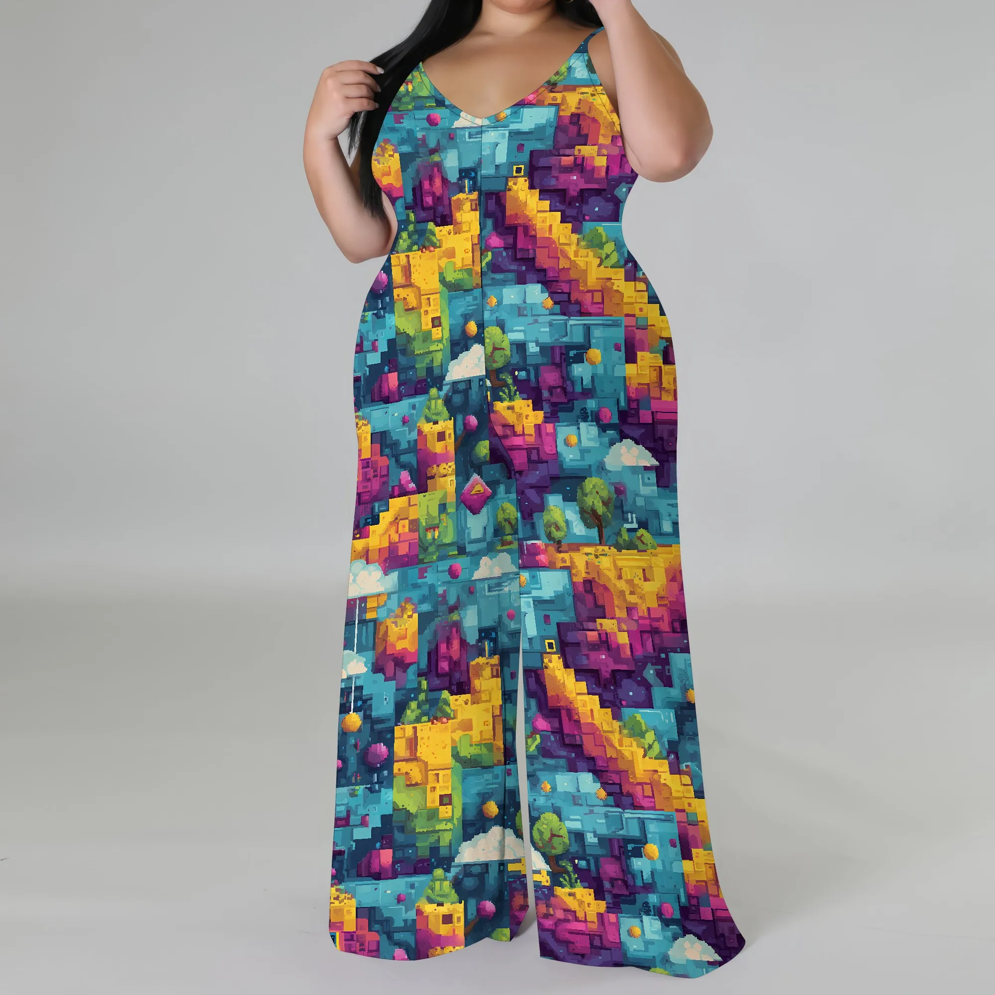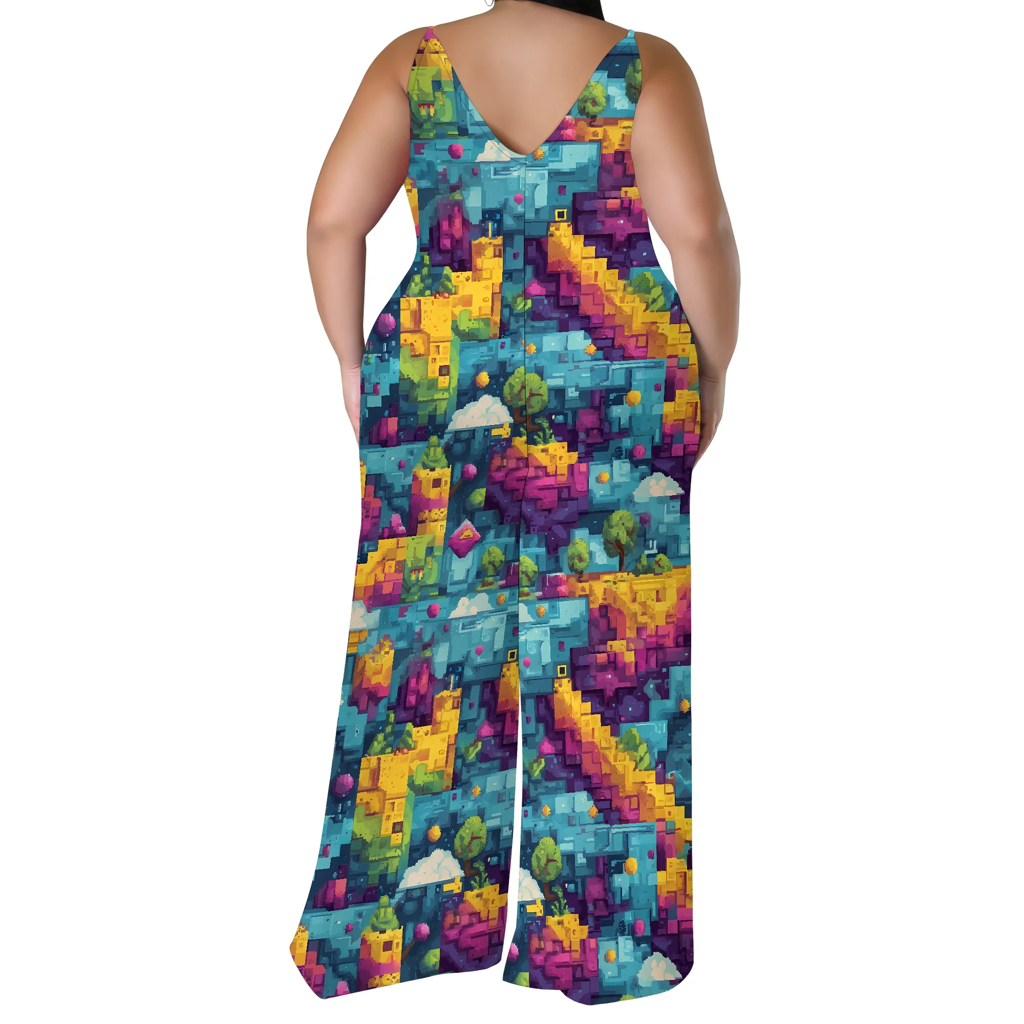 Plus Size Graphic Jumpsuit Colorful Pixel Landscape Print Wide Leg Sleeveless Romper for Women