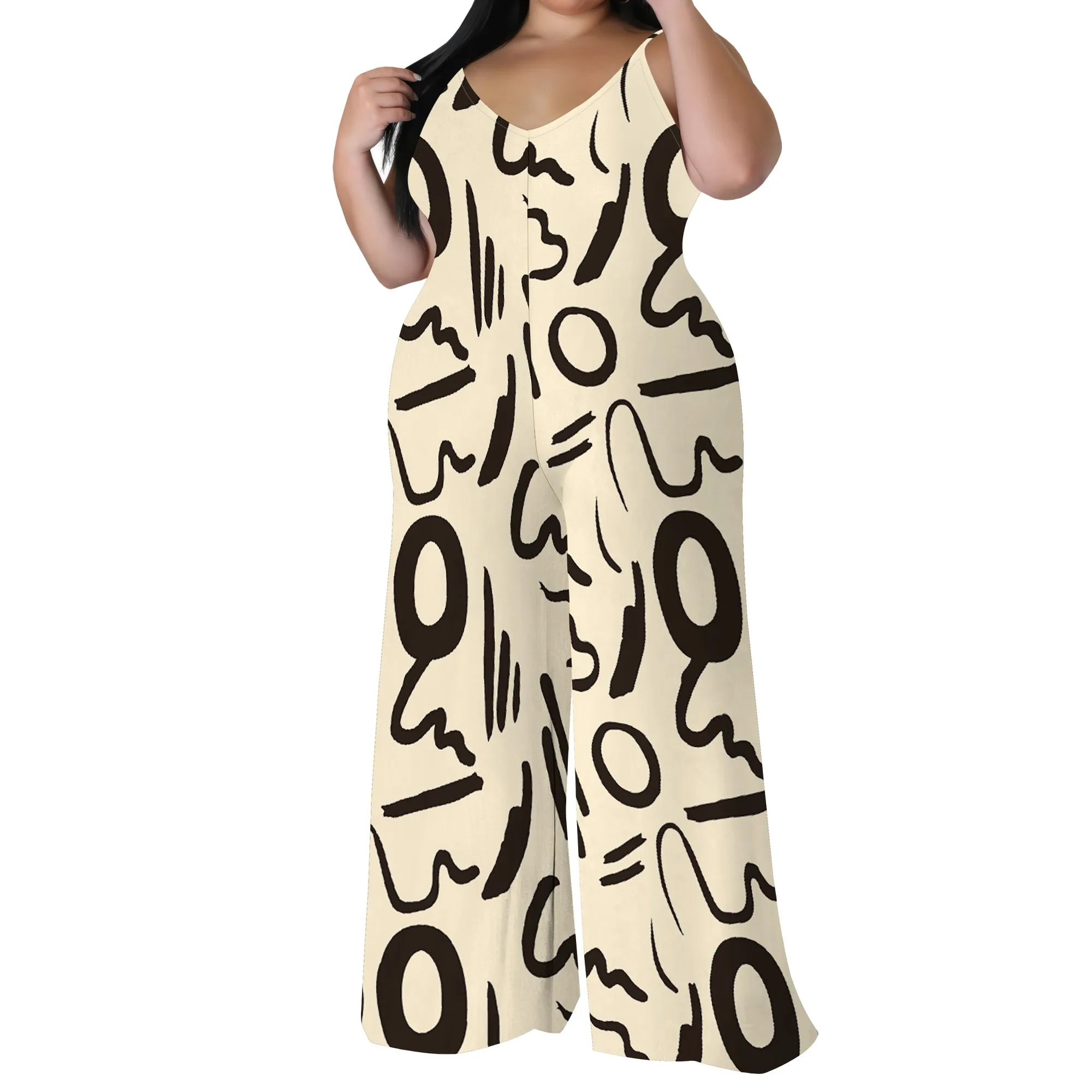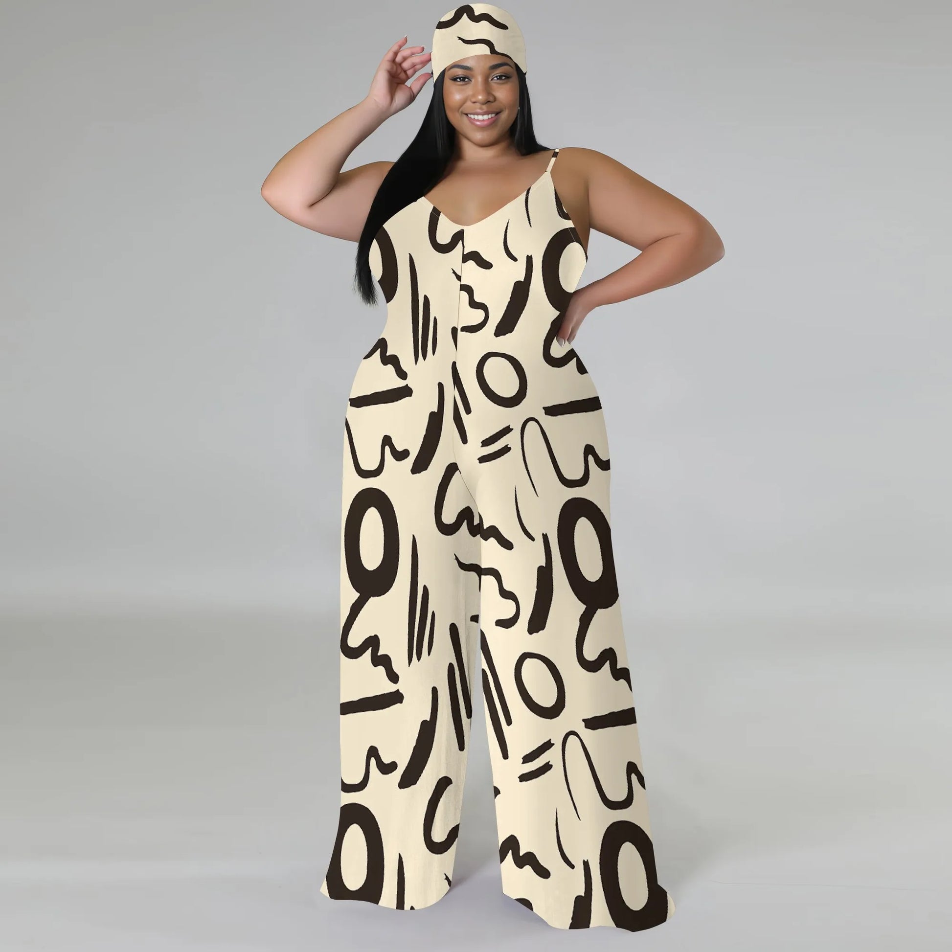 Plus Size Printed Jumpsuit - Strapless Wide Leg Romper with Scarf, Boho Palazzo Pants for Women