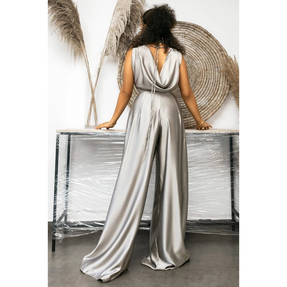 Plus Size Summer Fashion Women's Jumpsuit Casual Sleeveless Large Size Cyan Daily Satin High Neck Wide Leg Jumpsuit