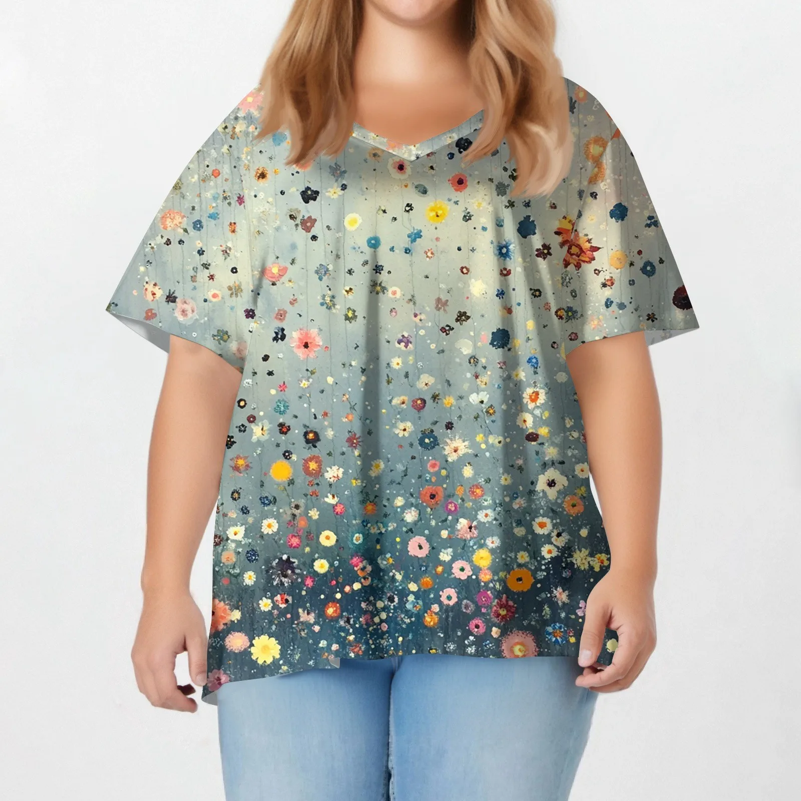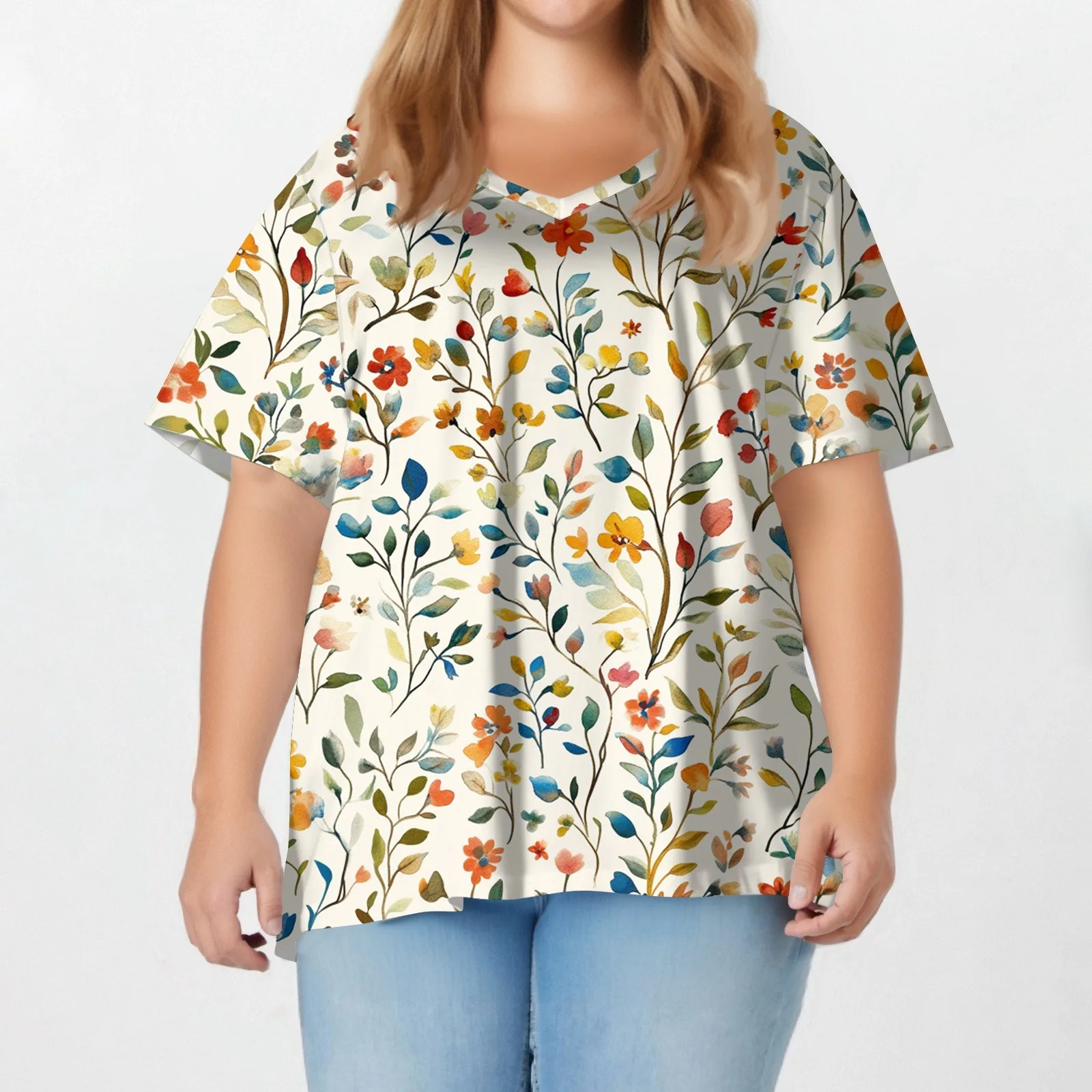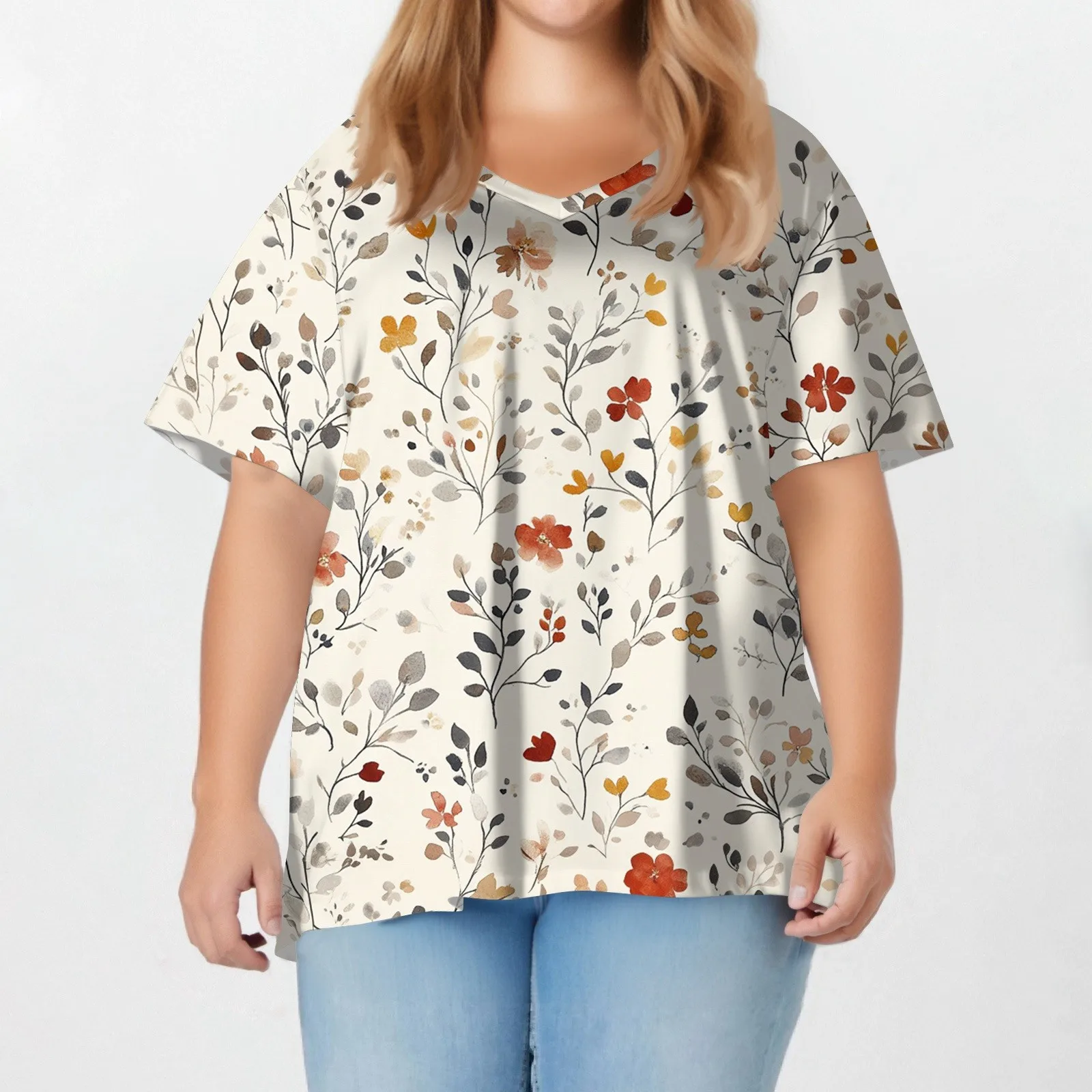 Plus size summer loose t shirt women's fashion casual v neck pullover short sleeve large size floral printed t-shirts top