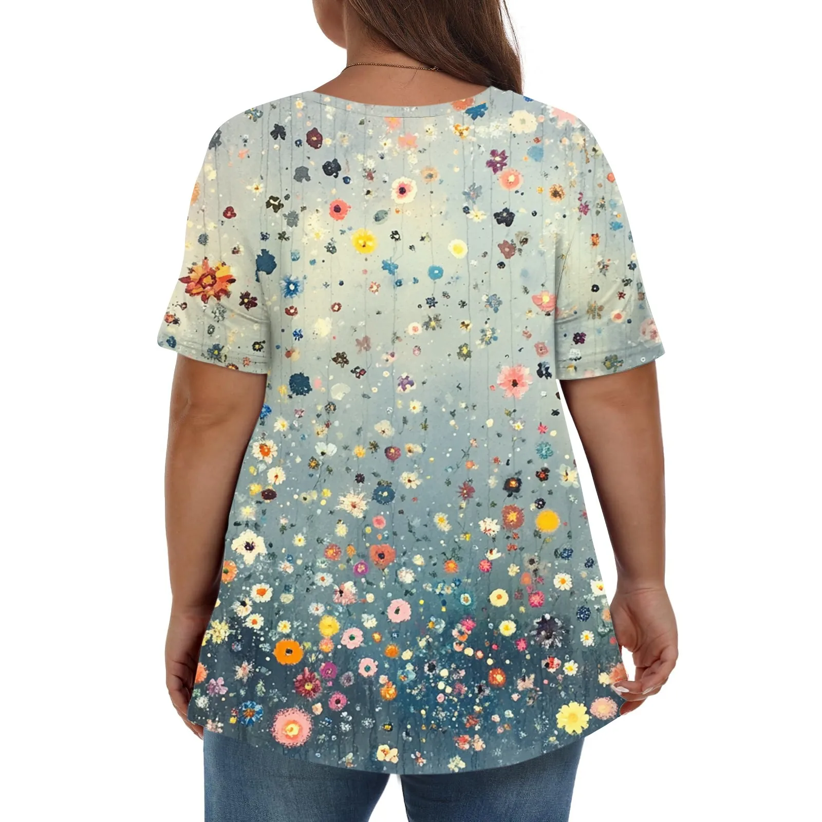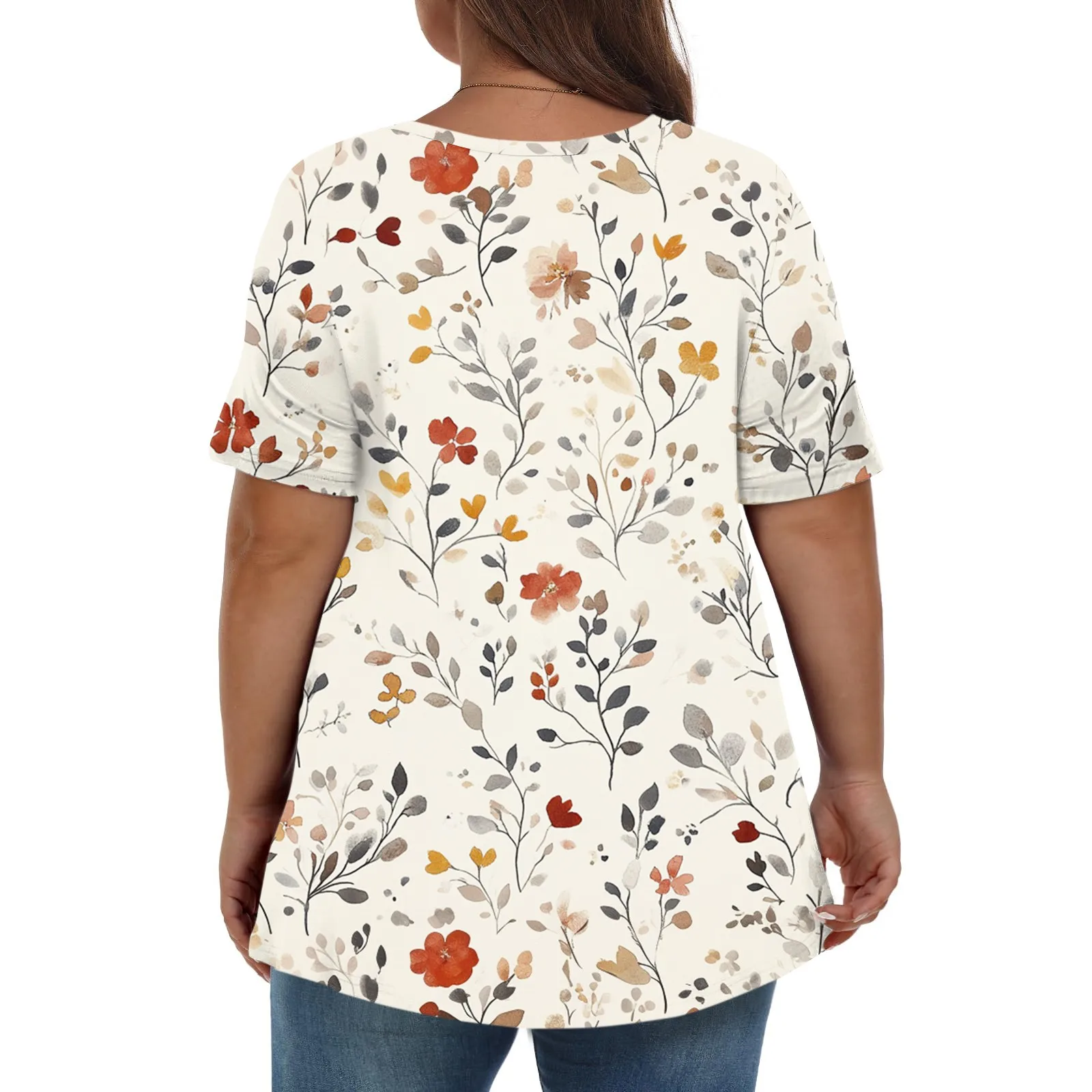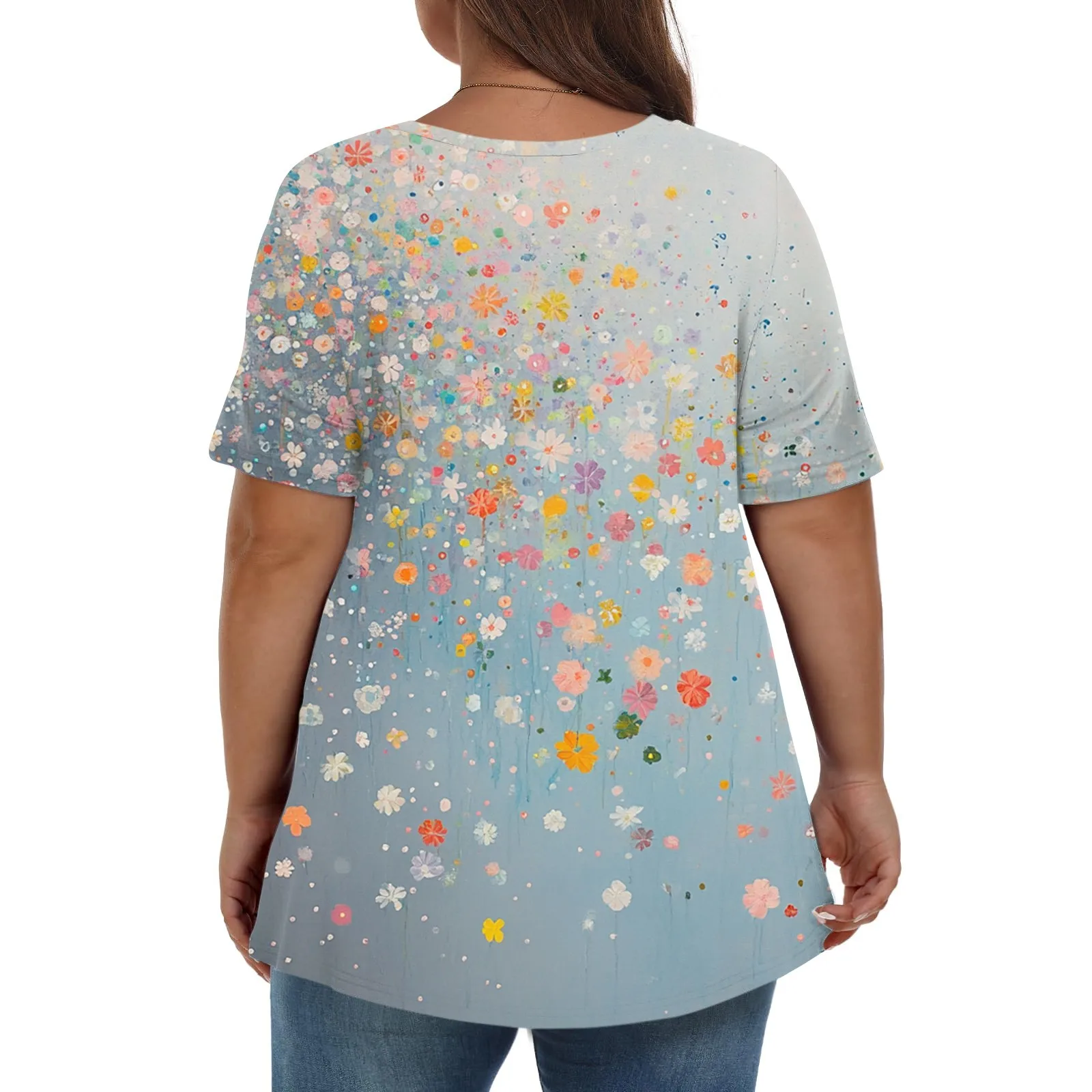 Plus size summer loose t shirt women's fashion casual v neck pullover short sleeve large size floral printed t-shirts top