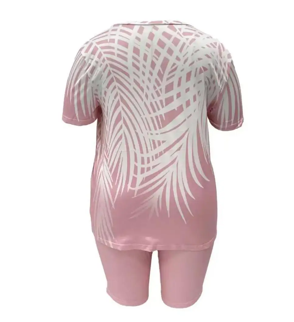 Plus size women's fashion casual vacation short sleeve set with printed top and solid color bottom.
