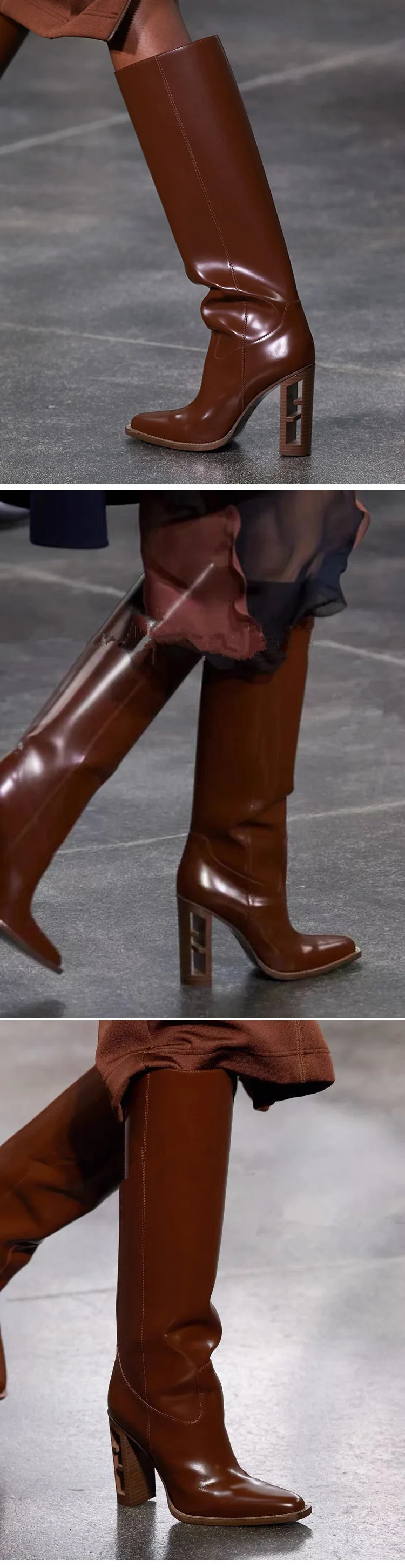 Fashion Show Solid Color Leather Knee-High Long Boots For Women Wood Grain Hollow Out Chunky High Heel Pointed Toe Catwalk Botas