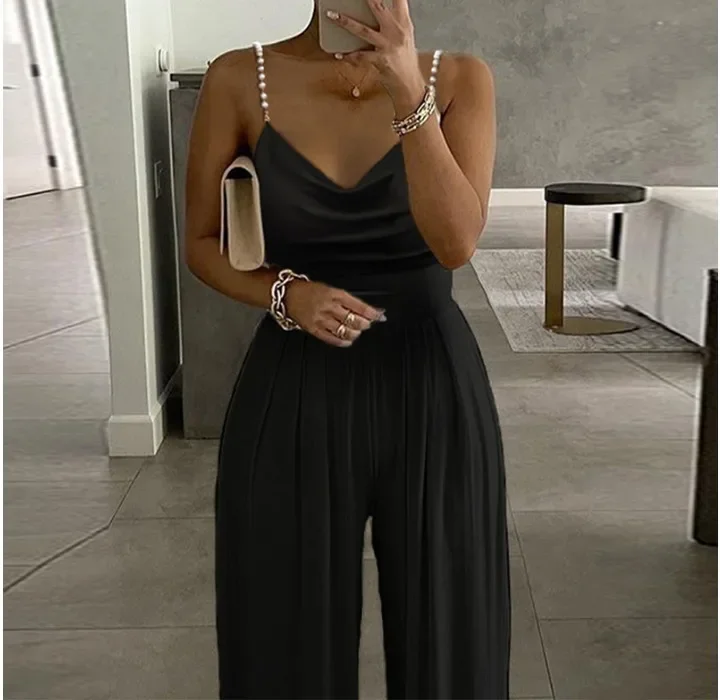 Sleeveless Jump Suits for Women Streetwear 2023 Autumn Pearl Suspender Wide Leg V-neck Backless Long Pants Jumpsuits of Female