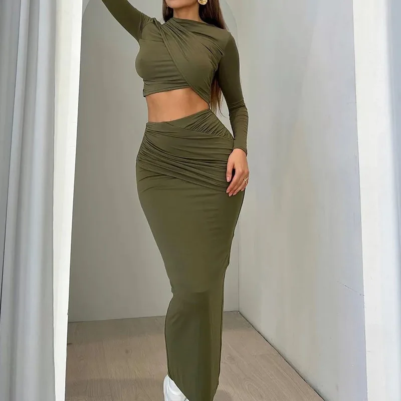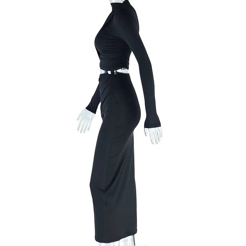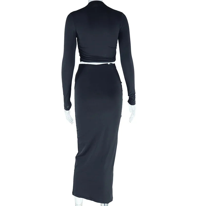 SsTss Sexy Two Pieces Set for Women Spring Summer Solid Ruched Long Sleeve Crop Top and High Waist Long Bodycon Skirt Suits