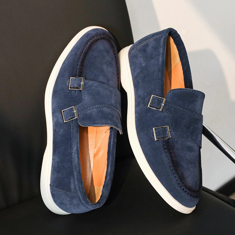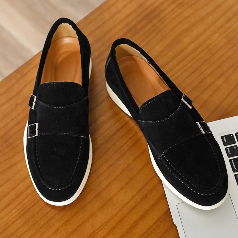 Suede Leather Men's Business Casual Shoes Handmade Double Buckle Loafers Leisure Slip on Flats Outdoor Male Driving Moccasins