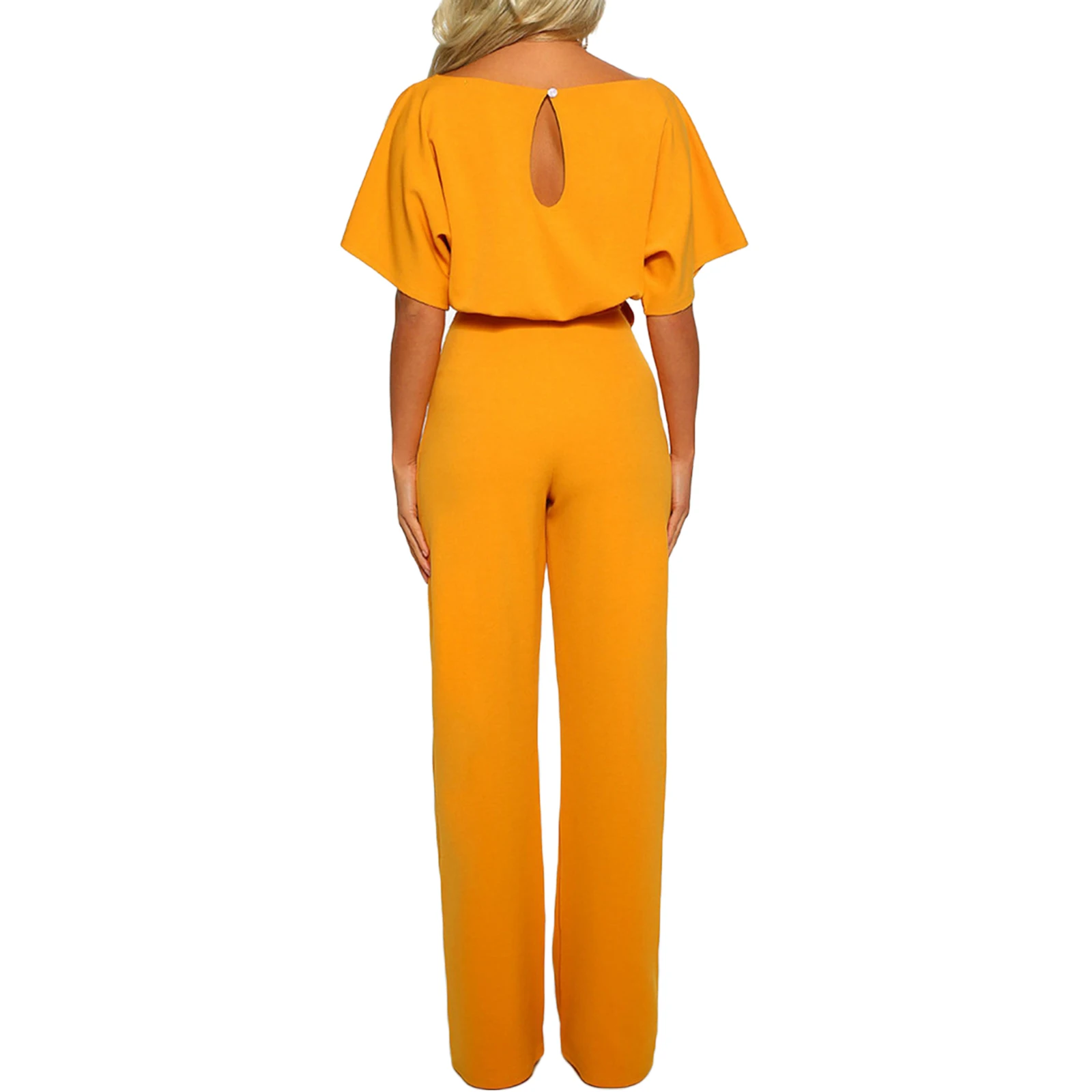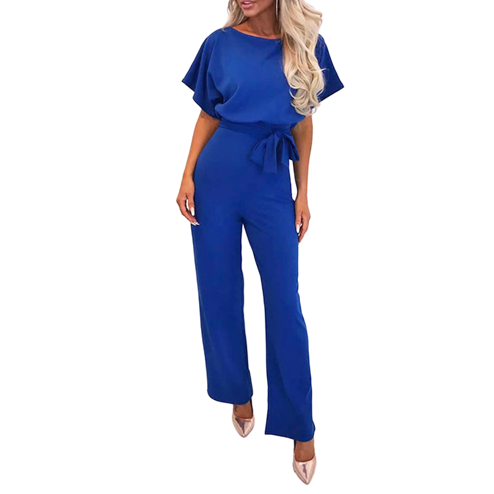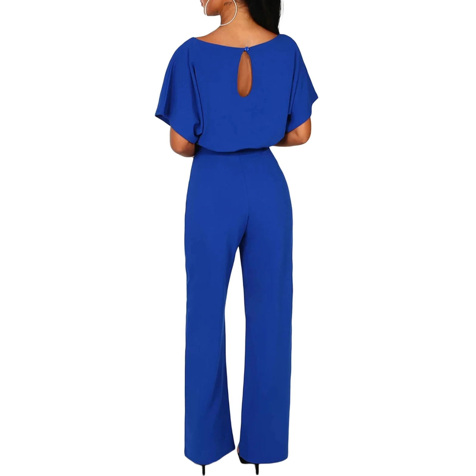 Women Daily Fashion Versatile Jumpsuit Sexy Solid Color Jumpsuit V-Neck Short Sleeve Open Back High Waist Elastic Loose Jumpsuit