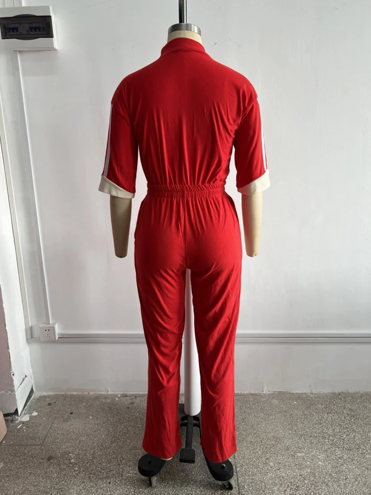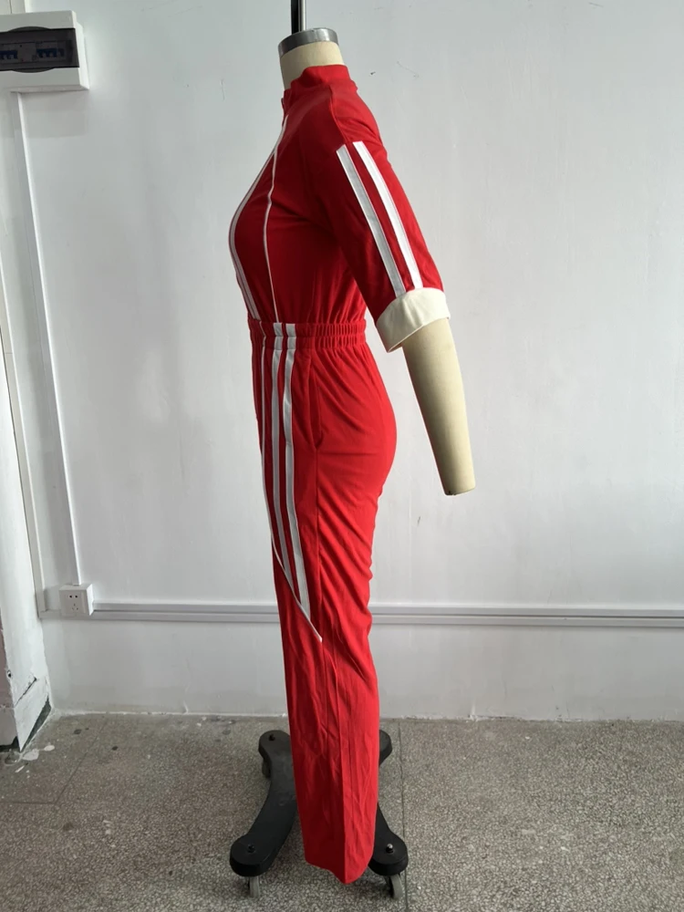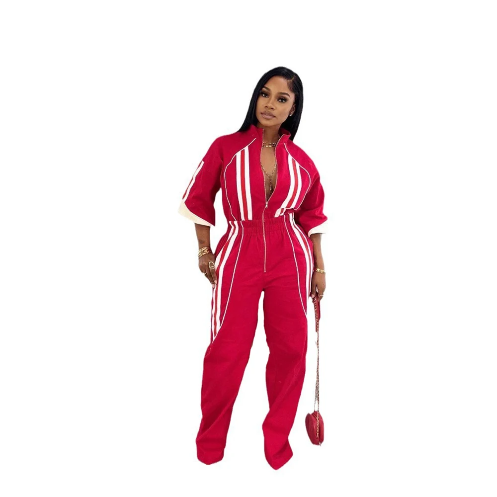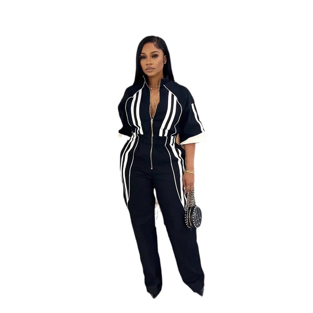 Women Jumpsuits for Spring Half Sleeve Zip Front Stripe Loose Trends Streetwear Overalls Wide Leg Pants Trousers 2025 Summer New